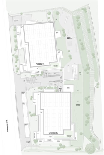 Nebst den Eingängen in der Einstellhalle sind die beiden Mehrfamilienhäuser im Sockelgeschoss mittels zwei Haupteingängen erschlossen. Der Aussenlift gewährleistet trotz abgetreppter Situation ein hindernisfreier Zugang. Auf der rückwärtigen Seite, zwischen den Häusern und dem leicht begrünten Hang, ergibt sich ein gemeinschaftlich nutzbarer Aussenplatz. Die teils bekieste, teils begrünte Fläche bietet Platz zum Spielen und Verweilen. Durch die Häuser wird der Aussenplatz von der Strasse abgeschirmt, was zu einem weiteren Plus-Punkt führt.